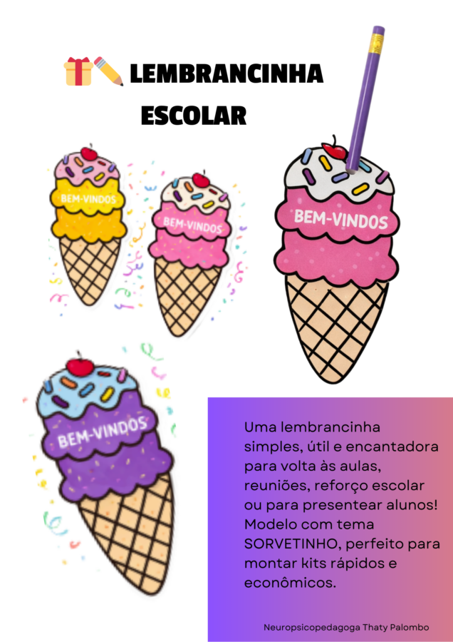 Arquivo digital de lembrancinha temática de sorvete, ideal para volta às aulas, recepção escolar, salas de aula, consultórios, eventos infantis e datas comemorativas.