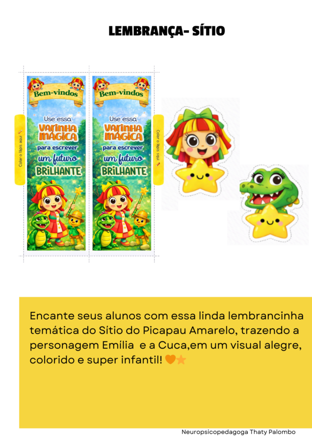 Encante seus alunos com essa linda lembrancinha temática do Sítio do Picapau Amarelo, trazendo a personagem Emília em um visual alegre, colorido e super infantil! 🧡⭐